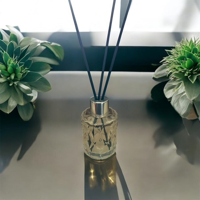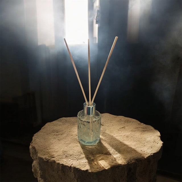 Die edle Glasflasche fügt sich dezent und modern in jedes Zuhause ein. Die Duftstäbchen – wahlweise in klassischem Schwarz oder hellem Naturholz – geben den Duft gleichmäßig an die Raumluft ab und schaffen eine harmonische Wohlfühlatmosphäre.